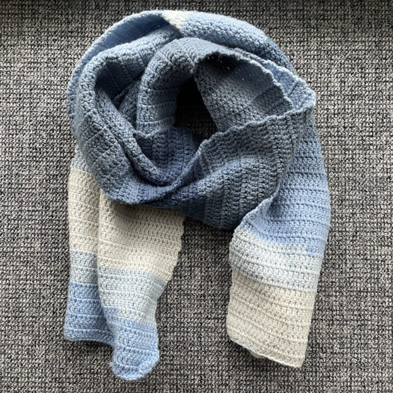 This scarf was my first ever actual project, besides the occasional coaster or pot holder. It took me roughly 2 1/2, 3 weeks to continue. Since it is only one stitch over and over again, this was a great thing to do on the side while watching a show or movie. Of course, I still had to pay a lot of attention to what I was doing at the beginning, but a couple of rows in, I started to become more relaxed.